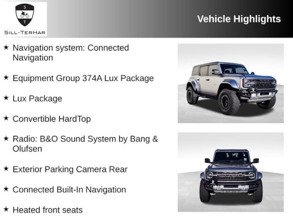 This 2022 Ford Bronco is rare!, Connected Built-In Navigation, Convertible HardTop, Equipment Group 374A Lux Package, Exterior Parking Camera Rear, Heated front seats, Lux Package, Navigation system: Connected Navigation, Radio: B&O Sound System by Bang & Olufsen, Wheels: 17" Dark Carbonized Gray Alloy Painted.