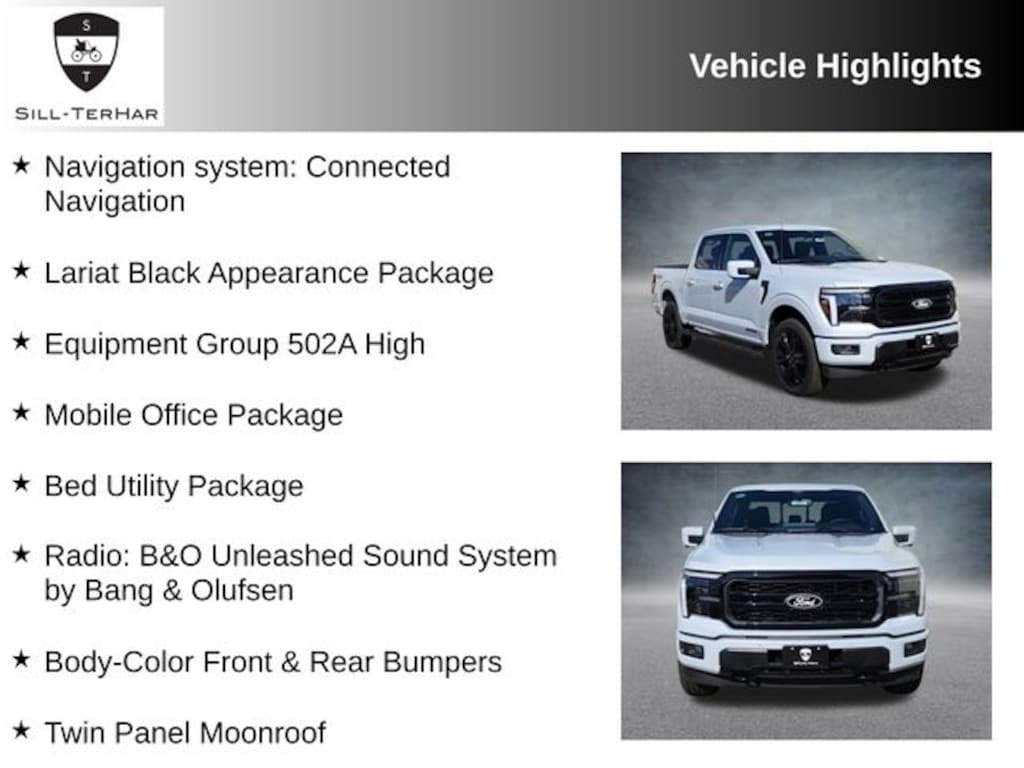 Space White Metallic 2025 Ford F-150 Lariat 4WD 10-Speed Automatic 3.5L PowerBoost Full-Hybrid V6 This 2025 Ford F-150 is rare!, 2nd Row Heated Seats, 4 Pickup Box Tie-Down Plates, ActiveX Trimmed Bucket Seats (B), Ambient Lighting - Ice Blue Color Only, Bed Utility Package, Black Exterior Badging, Black Grille, Black Taillamp Bezels, Body-Color Front & Rear Bumpers, Body-Color Skull Caps & Door Handles, Console Worksurface, Dark Interior Appliques, Equipment Group 502A High, Gray Box Side Decal, Heads-Up Display, Illuminated Driver & Passenger Visors, Lariat Black Appearance Package, LED Box Lighting, Matte Black Tailgate F-150 Decal, Mobile Office Package, Navigation system: Connected Navigation, Partitioned Lockable Rear Storage, Power Tailgate, Power-Sliding Rear Window, Pro Access Tailgate, Radio: B&O Unleashed Sound System by Bang & Olufsen, Twin Panel Moonroof, Wheels: 22" Gloss Black w/o Inserts, Wireless Charging.