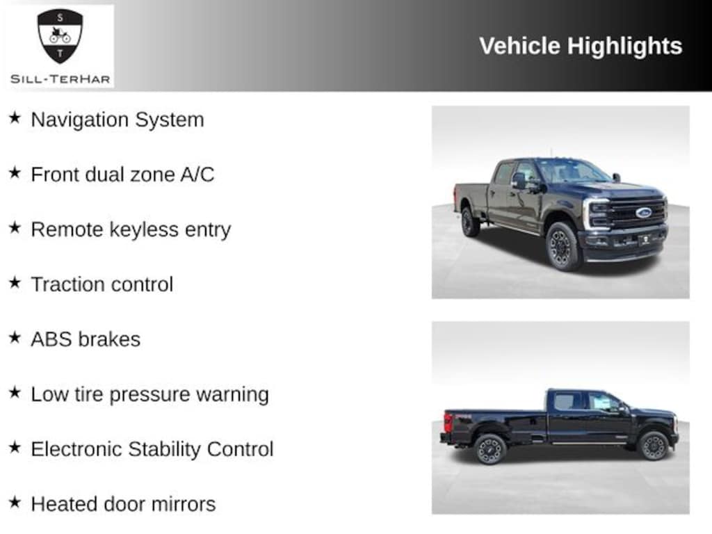 Agate Black Metallic 2025 Ford F-350SD Platinum 4WD 10-Speed Automatic Power Stroke 6.7L V8 DI 32V OHV Turbodiesel ABS brakes, Alloy wheels, Compass, Electronic Stability Control, Front dual zone A/C, Heated door mirrors, Heated front seats, Heated rear seats, Illuminated entry, Low tire pressure warning, Navigation System, Remote keyless entry, Traction control.