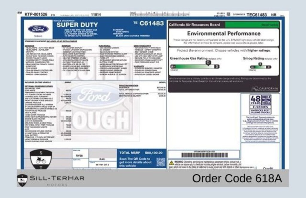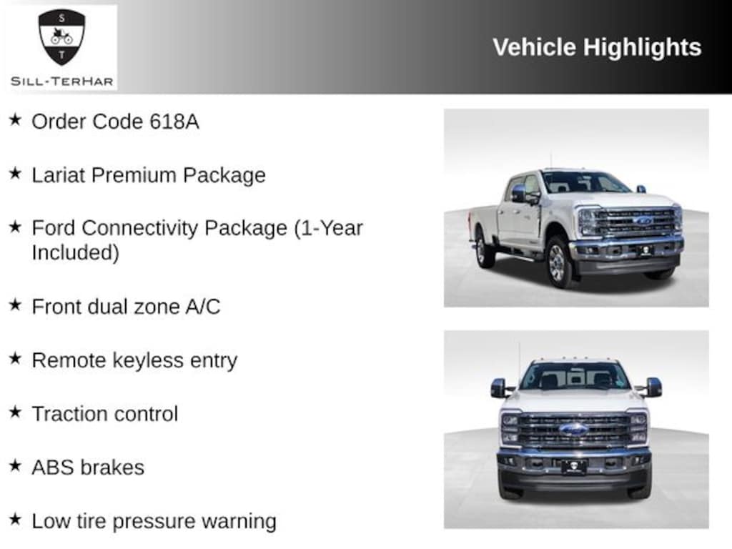 Star White Metallic Tri-Coat 2026 Ford F-350SD Lariat 4WD 10-Speed Automatic Power Stroke 6.7L V8 DI 32V OHV Turbodiesel ABS brakes, Alloy wheels, Compass, Electronic Stability Control, Ford Connectivity Package (1-Year Included), Front dual zone A/C, Heated door mirrors, Heated front seats, Heated rear seats, Illuminated entry, Lariat Premium Package, Low tire pressure warning, Order Code 618A, Privacy Glass, Pro Trailer Backup Assist, Pro Trailer Hitch Assist, Remote keyless entry, Traction control.
