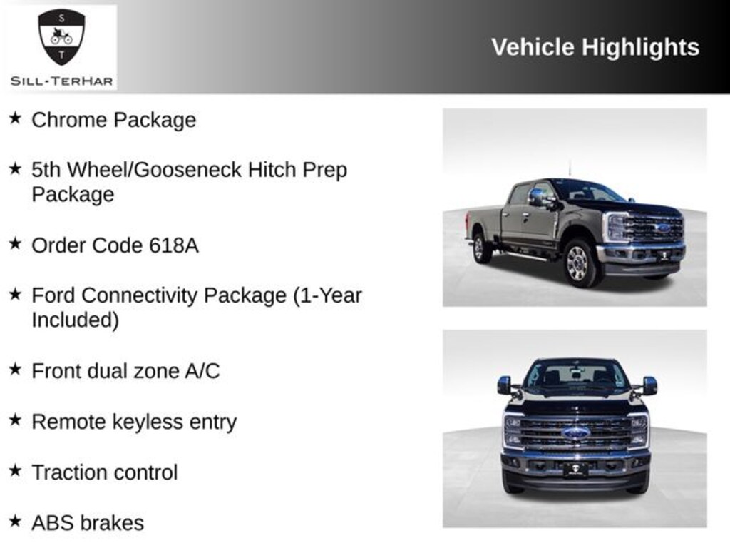Agate Black Metallic 2026 Ford F-350SD Lariat 4WD 10-Speed Automatic Power Stroke 6.7L V8 DI 32V OHV Turbodiesel 5th Wheel/Gooseneck Hitch Prep Package, 6" Angular Bright Anodized Step Bars, ABS brakes, Alloy wheels, Chrome Door Handles, Chrome Exhaust Tip, Chrome Package, Compass, Electronic Stability Control, Ford Connectivity Package (1-Year Included), Front dual zone A/C, Heated door mirrors, Heated front seats, Heated rear seats, Illuminated entry, Low tire pressure warning, Order Code 618A, Remote keyless entry, Traction control, Twin Panel Power Moonroof, Unique Chrome Mirror Caps, Wheels: 20" Chrome PVD Aluminum.