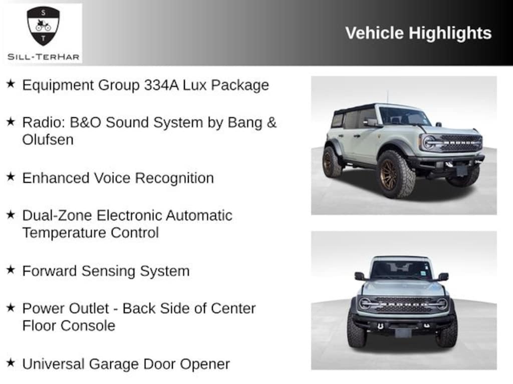 This 2021 Ford Bronco is rare!, 12" LCD Capacitive Touchscreen w/Swipe Capability, 2 Smart Charging USB Ports In Dashboard, 2-Door Intelligent Access w/Lock/Unlock, 360-Degree Camera, Adaptive Cruise Control, Additional Sound Deadening, Ambient Footwell Lighting, Auto-Dimming Interior Rear-View Mirror, Connected Built-In Navigation, Dr & Pass Illuminated Sliding Visor Vanity Mirrors, Dual-Zone Electronic Automatic Temperature Control, Enhanced Voice Recognition, Equipment Group 334A Lux Package, Evasive Steering Assist, Forward Sensing System, Front Row Heated Seats, Heated Steering Wheel, Information on Demand Panel, Power Outlet - Back Side of Center Floor Console, Radio: B&O Sound System by Bang & Olufsen, Reverse Sensing System, Sideview Mirrors, Universal Garage Door Opener, Wireless Charging Pad.